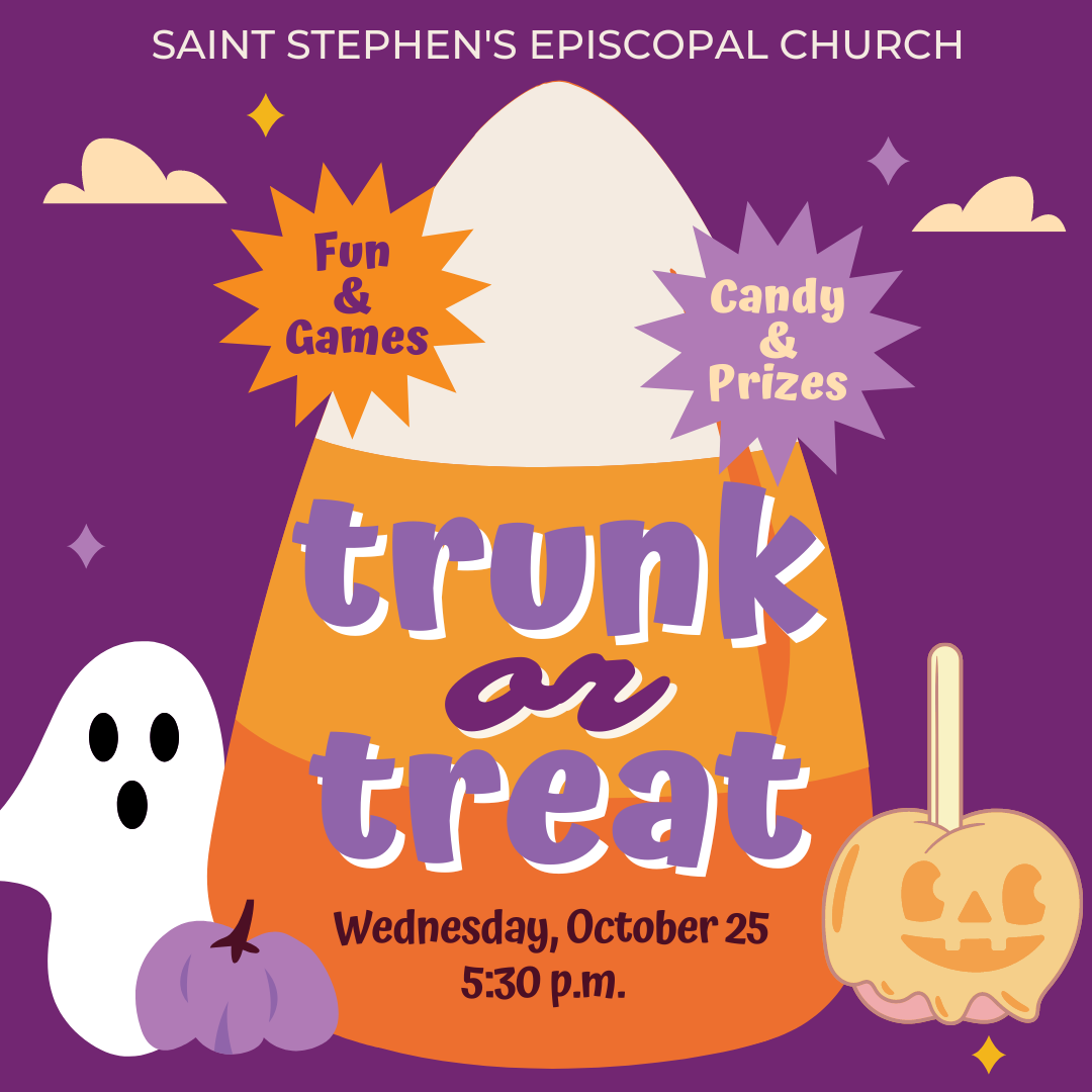 Trunk or Treat Wednesday, October 25, 2023 5:30 PM 7:00 PM Saint Stephen's Episcopal Church 3775 Crosshaven Drive Birmingham, AL, 35223 United States (map) Google Calendar ICS We are excited to have our annual Trunk or Treat event back on Wednesday, October 25th at 5:30 p.m.. Put on your favorite costume and join us for games, prizes, trick or treating, and dinner.We will need help with decorated trunks, games, baked goods, and candy donations for the event. Please click here for more information.