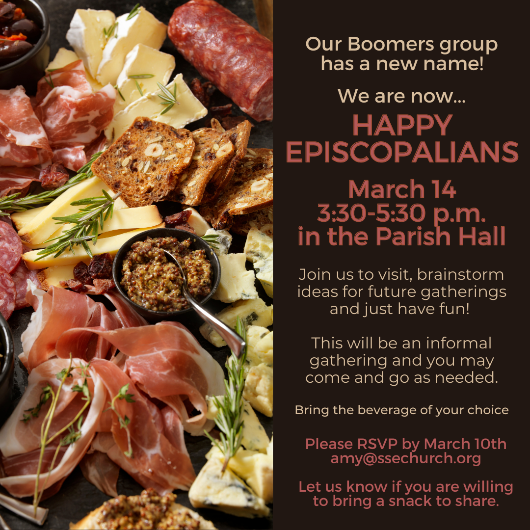 Happy Episcopalians Monday, March 14, 2022 3:30 PM 5:30 PM Saint Stephen's Episcopal Church 3775 Crosshaven Drive Birmingham, AL, 35223 United States (map) Google Calendar ICS Click the image above to RSVP for the event.