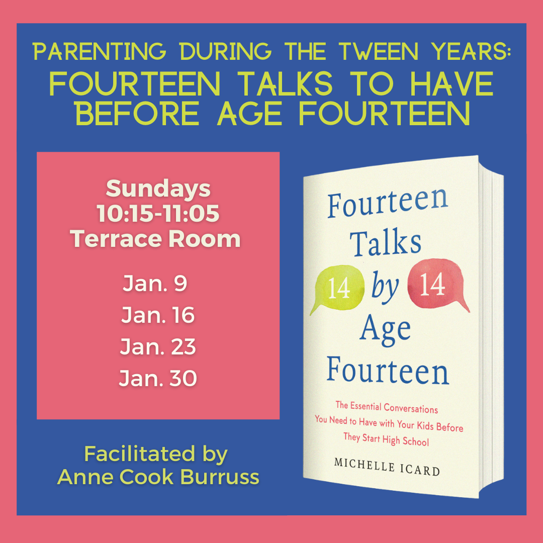 Discussion group for parents of children approaching or currently in the tween & early teen years. Anne Cook Burruss, ALC, MA in Education and Human Development with a concentration in School Counseling, will facilitate discussions based on the book, Fourteen Talks by Age Fourteen by Michelle Icard. We will discover the fourteen essential conversations to have with your tween and early teenager to prepare them for the emotional, physical, and social challenges ahead, including scripts and advice to keep the communication going and stay connected during this critical developmental window. Anne is currently the school counselor at Indian Springs School.