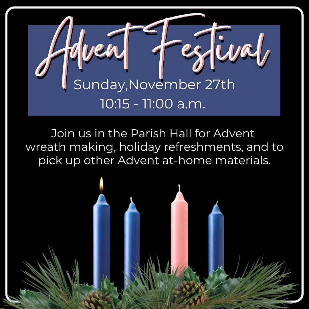 Begin the season of Advent with us Sunday, November 27 at 10:15 in the Parish Hall at our annual Advent Festival. You will be able to pick up materials to use in your home throughout Advent while enjoying refreshments and coffee.