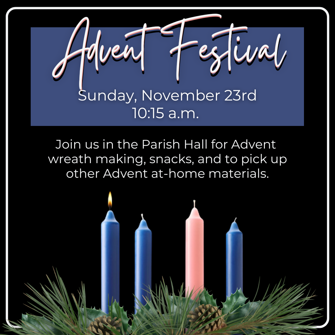 Begin the season of Advent with us on Wednesday, November 23rd at 10:15 a.m. in the Parish Hall at our annual Advent Festival. You will be able to pick up materials to use in your home throughout Advent while enjoying dinner with your family.
