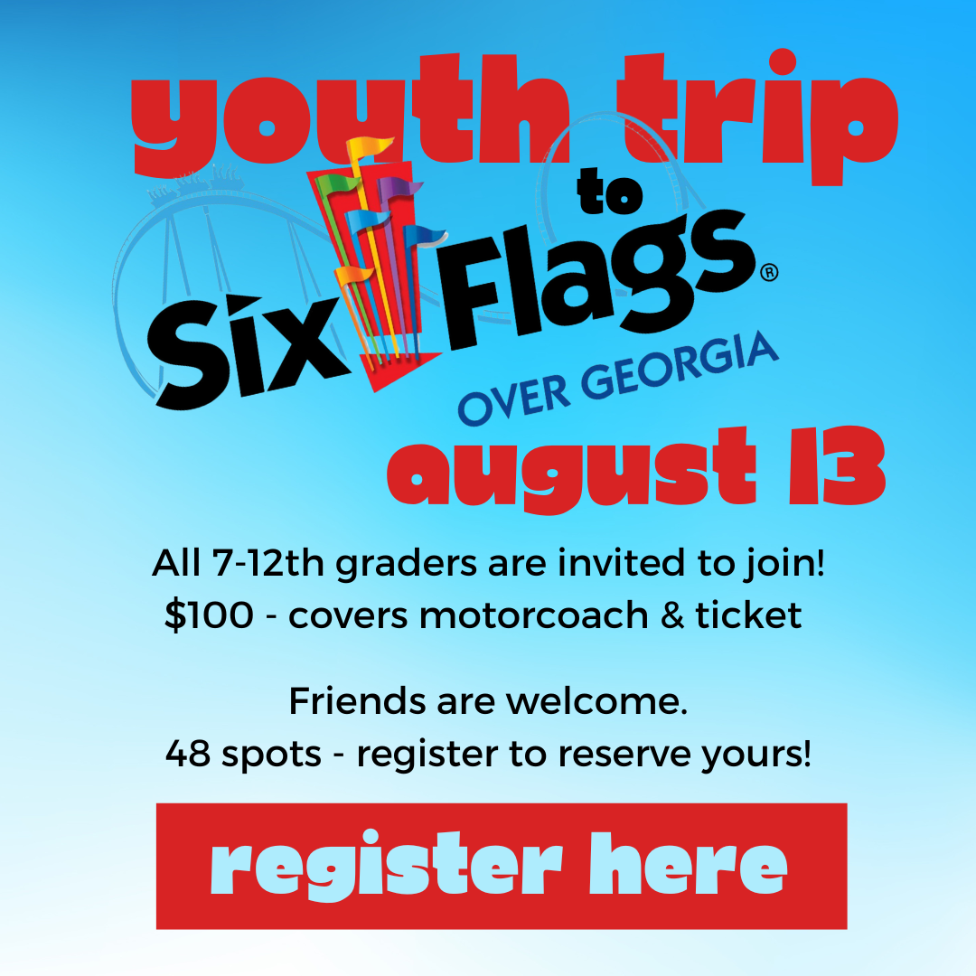 Youth Trip to Six Flags! Saturday, August 13, 2022 6:00 AM 7:00 PM Saint Stephen's Episcopal Church 3775 Crosshaven Drive Birmingham, AL, 35223 United States (map) Google Calendar ICS