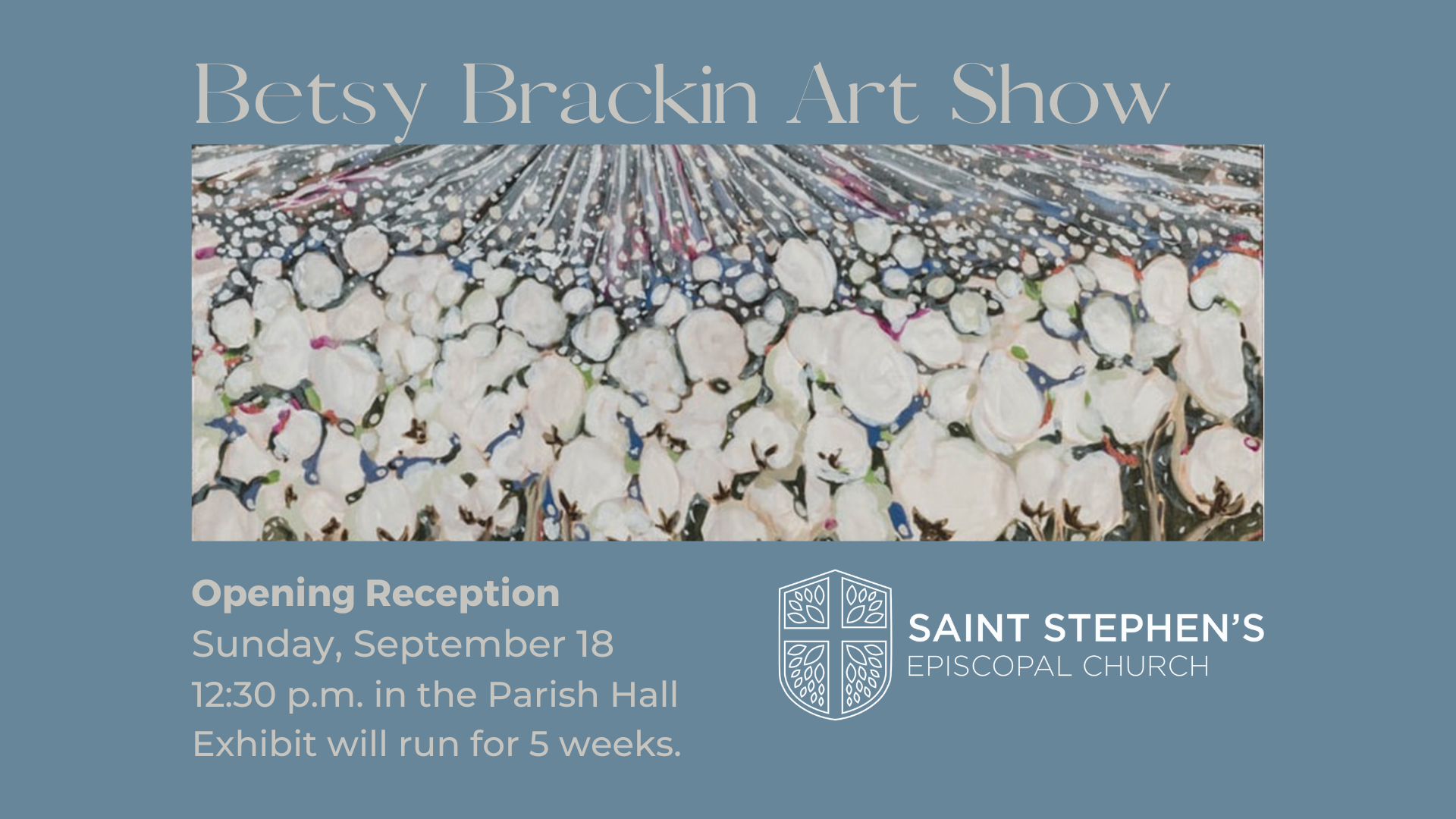 Saint Stephen’s is excited to welcome the return of our art exhibitions with a show launching on Sunday, September 18. Beginning with an opening reception and running for five weeks, the halls of Saint Stephen’s from the Nave to the Parish Hall will be lined with the work of Betsy Brackin.