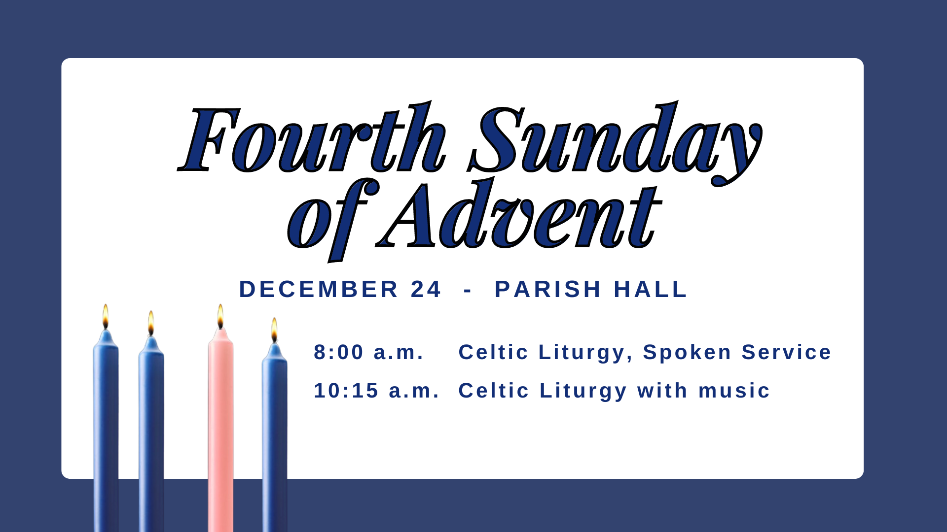 The Fourth Sunday of Advent Celtic Services Sunday, December 24, 2023 8:00 AM 11:15 AM Saint Stephen's Episcopal Church 3775 Crosshaven Drive Birmingham, AL, 35223 United States (map) Google Calendar ICS Join the 10:15 a.m. service on YouTube Service Leaflet for the Fourth Sunday of Advent