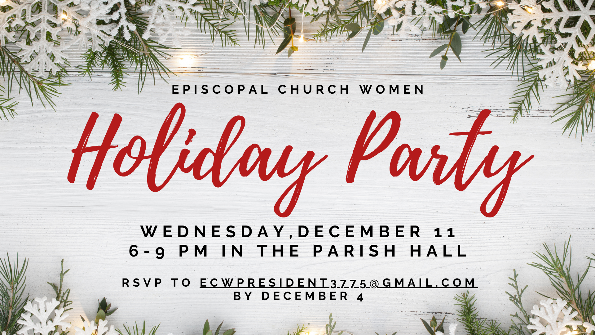 ECW Holiday Party Wednesday, December 11, 2024 6:00 PM 9:00 PM Saint Stephen's Episcopal Church 3775 Crosshaven Drive Birmingham, AL, 35223 United States (map) Google Calendar ICS