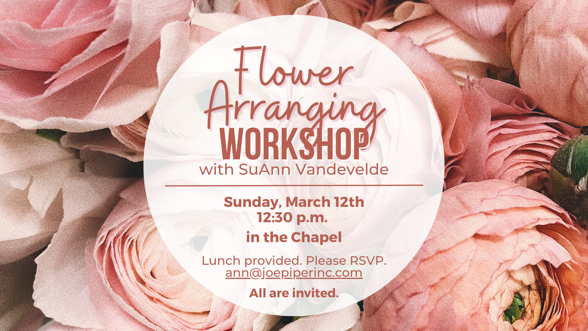 Flower Arranging Workshop Sunday, March 12, 2023 12:30 PM 2:00 PM Saint Stephen's Episcopal Church 3775 Crosshaven Drive Birmingham, AL, 35223 United States (map) Google Calendar ICS