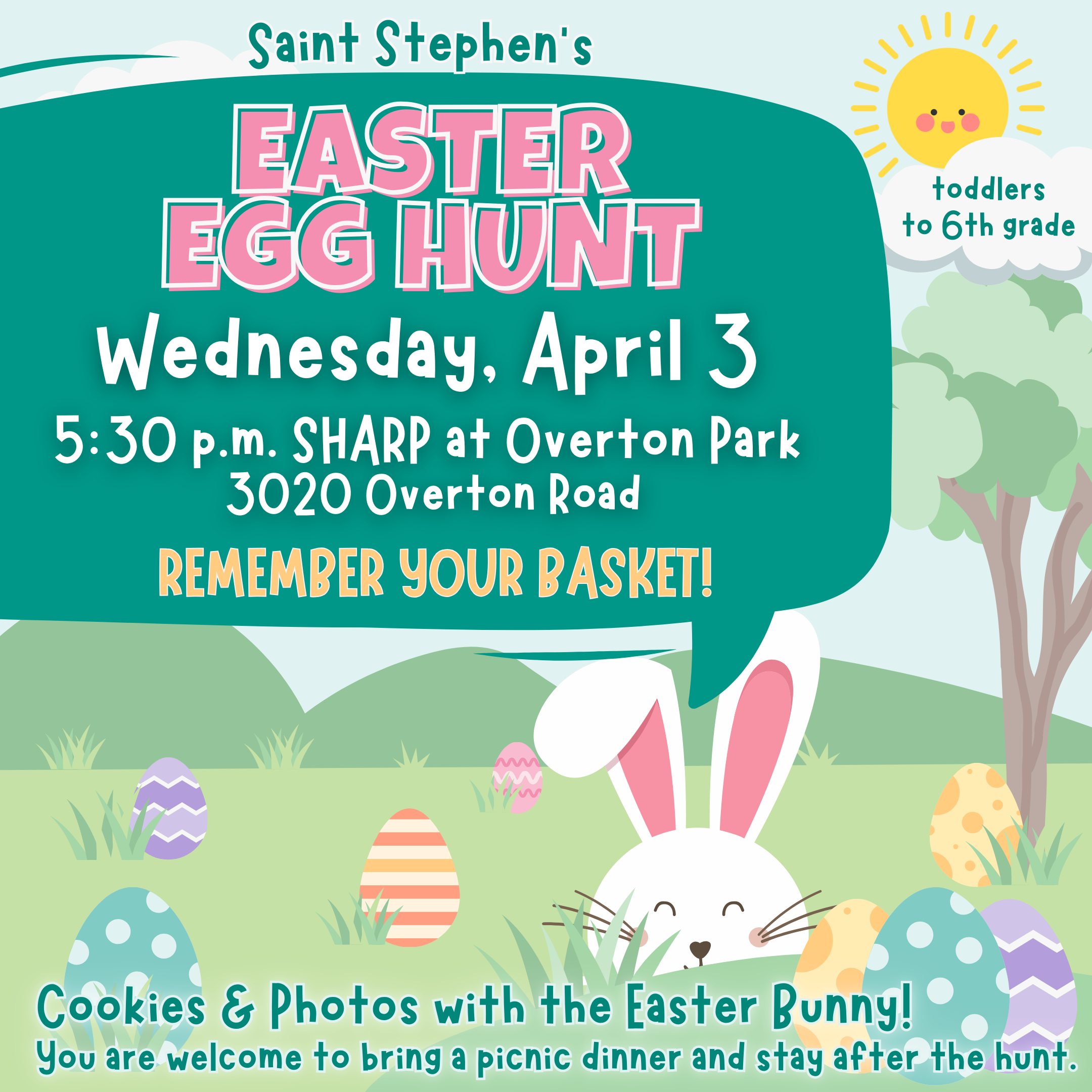 Bring your basket and your friends. We will have Easter cookies and photo ops with the Easter bunny. You are welcome to bring a picnic dinner and stay after the hunt and enjoy the park and the fellowship of your Saint Stephen’s friends. We look forward to seeing you!