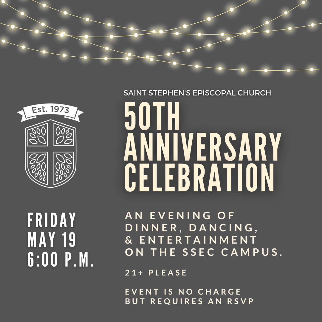 50th Anniversary Party Friday, May 19, 2023 6:00 PM 10:00 PM Saint Stephen's Episcopal Church 3775 Crosshaven Drive Birmingham, AL, 35223 United States (map) Google Calendar ICS All 21+ are welcome to join us! Please RSVP through your Realm account or by calling the church office. We are looking forward to celebrating together!