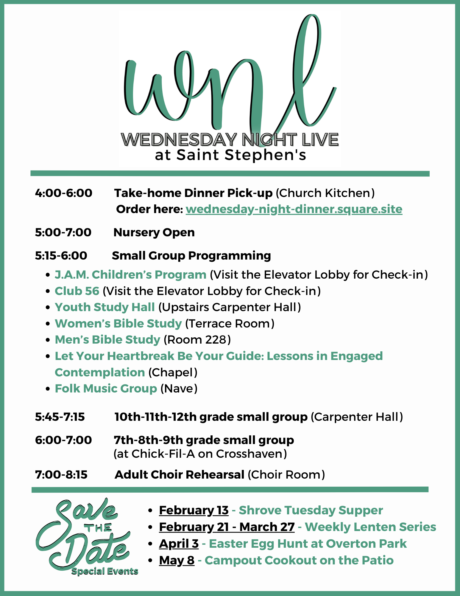 Wednesday Night Live This Week! Wednesday, January 31, 2024 5:15 PM 8:15 PM Saint Stephen's Episcopal Church 3775 Crosshaven Drive Birmingham, AL, 35223 United States (map) Google Calendar ICS Download the complete WNL schedule here.