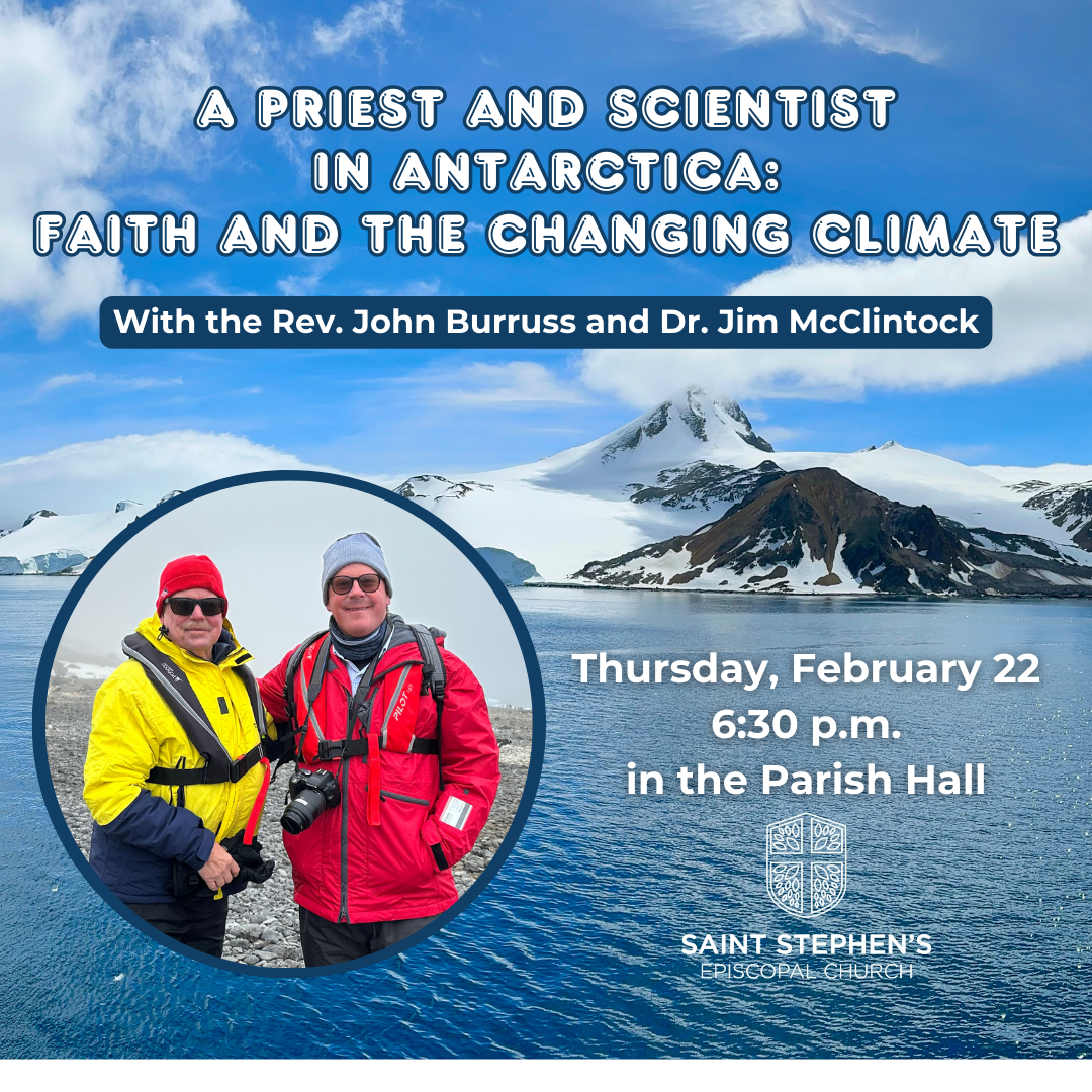 A Priest and Scientist in Antarctica: Faith and the Changing Climate. Thursday, February 22, 2024 6:30 PM 7:30 PM Saint Stephen's Episcopal Church 3775 Crosshaven Drive Birmingham, AL, 35223 United States (map) Google Calendar ICS The lecture with lots of pictures will be about 50 minutes and we will have time for questions following. I hope you will join in this important conversation.