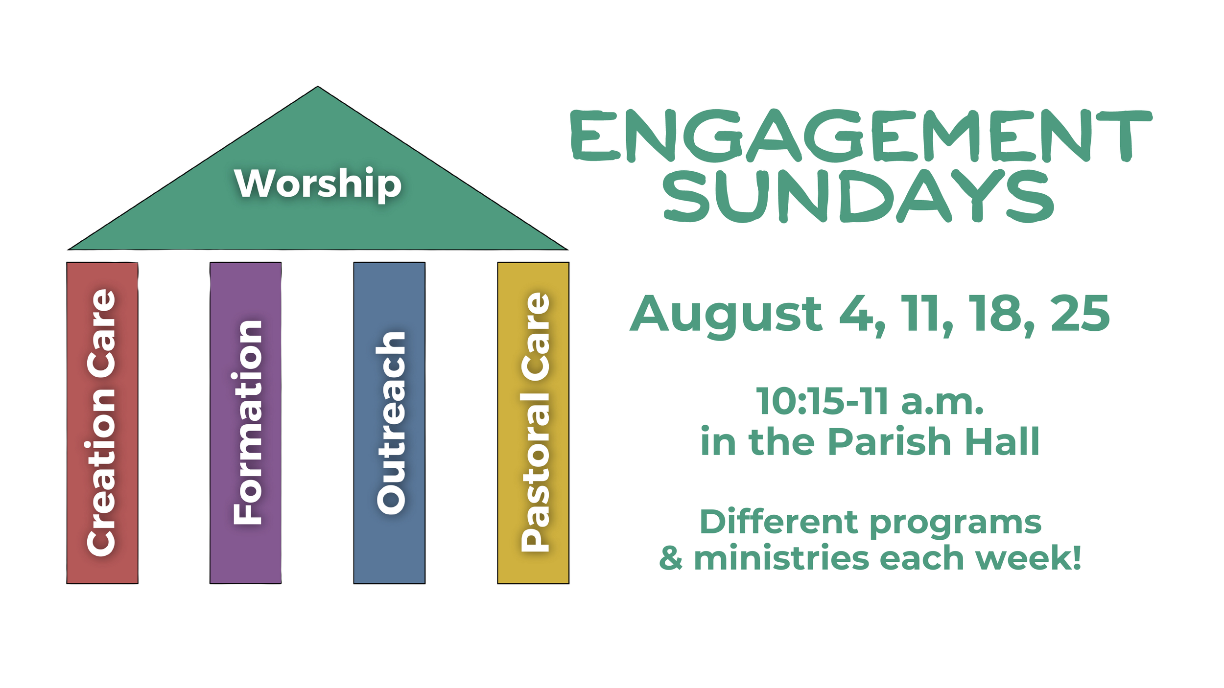 Join us in the Parish Hall for Engagement Sundays each week in August from 10:15 to 11:00 a.m. There will be snacks and opportunities to meet with ministry leaders and update your directory info in Realm.