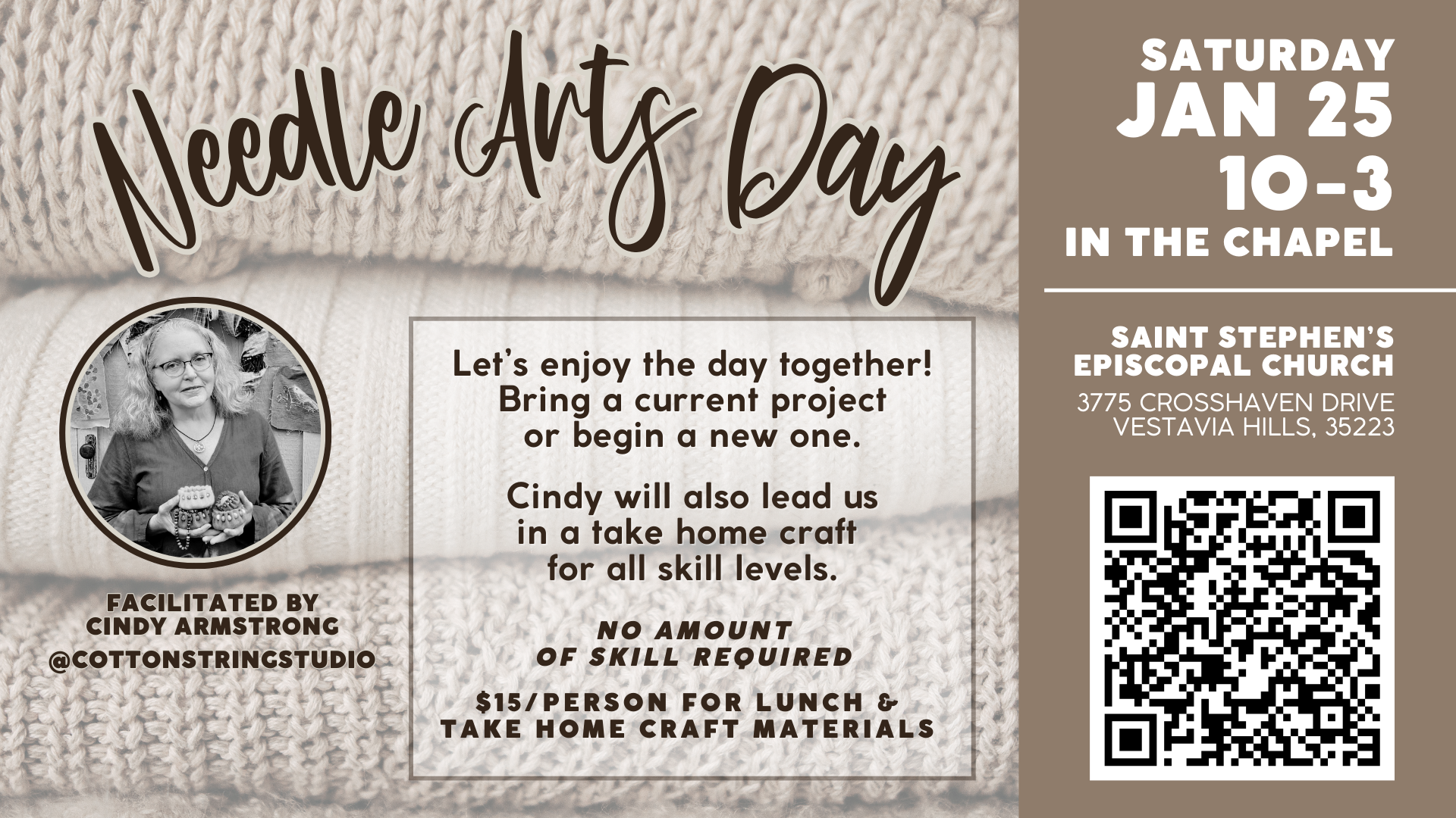 On Saturday, January 25 from 10 am - 3 pm, Saint Stephen's will host a Needle Arts Day for those who knit, crochet, weave, needlepoint, etc. to the Parish Hall for a day of fellowship, crafting, and learning.