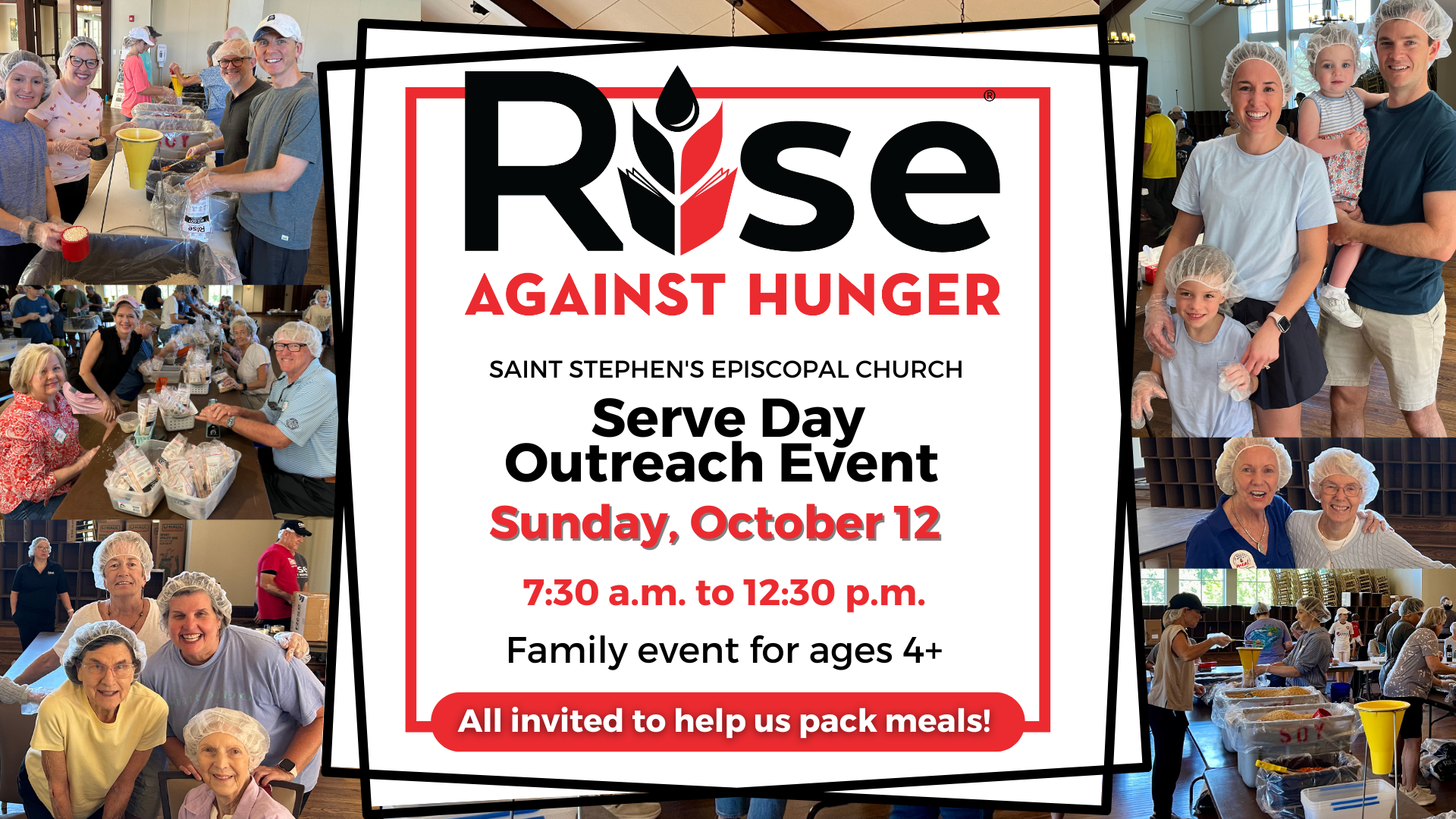 Rise Against Hunger Outreach Event Sunday, October 12, 2025 7:30 AM 12:30 PM Saint Stephen's Episcopal Church 3775 Crosshaven Drive Birmingham, AL, 35223 United States (map) Google Calendar ICS We will be packing meals for Rise Against Hunger to help feed our global community. All are invited to join us in the Parish Hall for this fun, all-ages outreach opportunity! You are welcome to join in before or after attending any morning service.