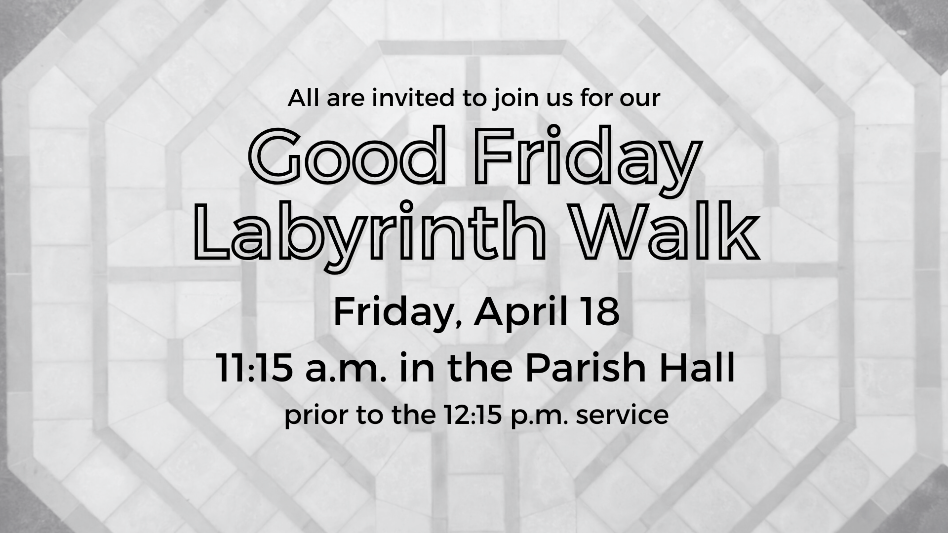 Good Friday Labyrinth Walk - 11:15 a.m. Friday, April 18, 2025 11:15 AM 12:00 PM Saint Stephen's Episcopal Church 3775 Crosshaven Drive Birmingham, AL, 35223 United States (map) Google Calendar ICS