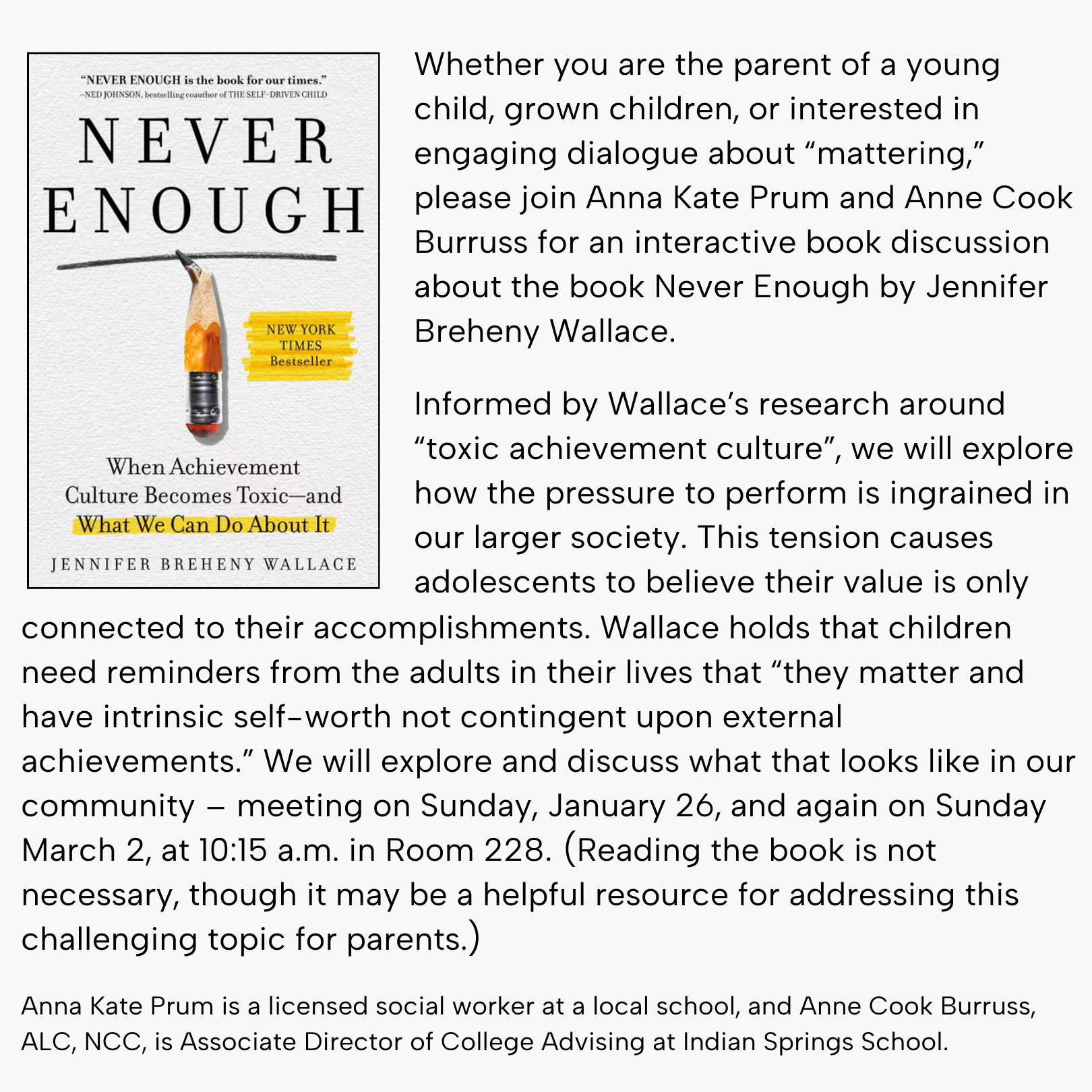 This week, our Faith & Life Class in Room 228 is open to parents of all ages. We welcome Anna Kate Prum, LICSW, and Anne Cook Burruss, ALC, NCC. They will be talking about a book called Never Enough, by Jennifer Breheny. This is a two part discussion that will finish on March 2.