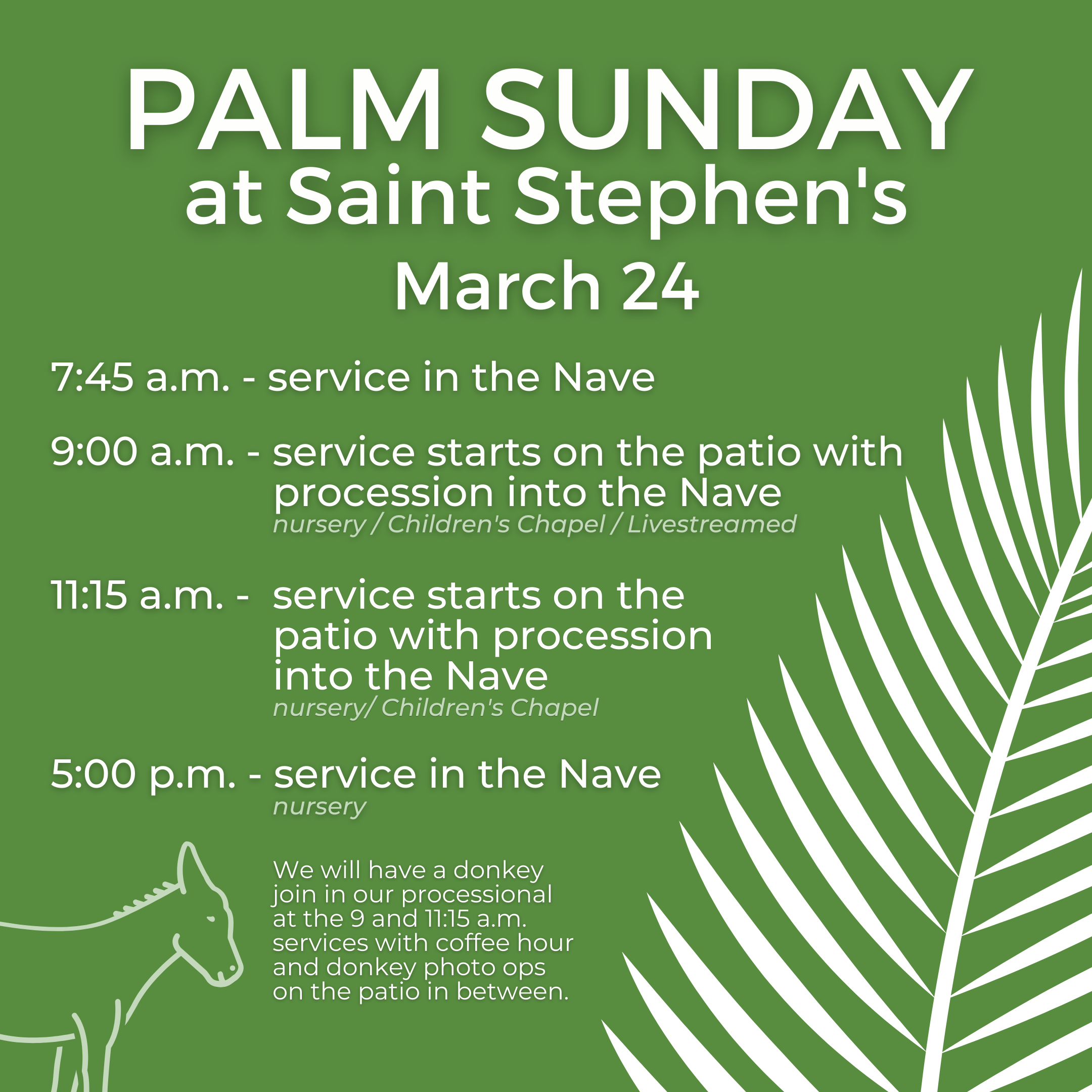 Join us on Palm Sunday, March 24. We will offer morning services at 7:45, 9:00, and 11:15.