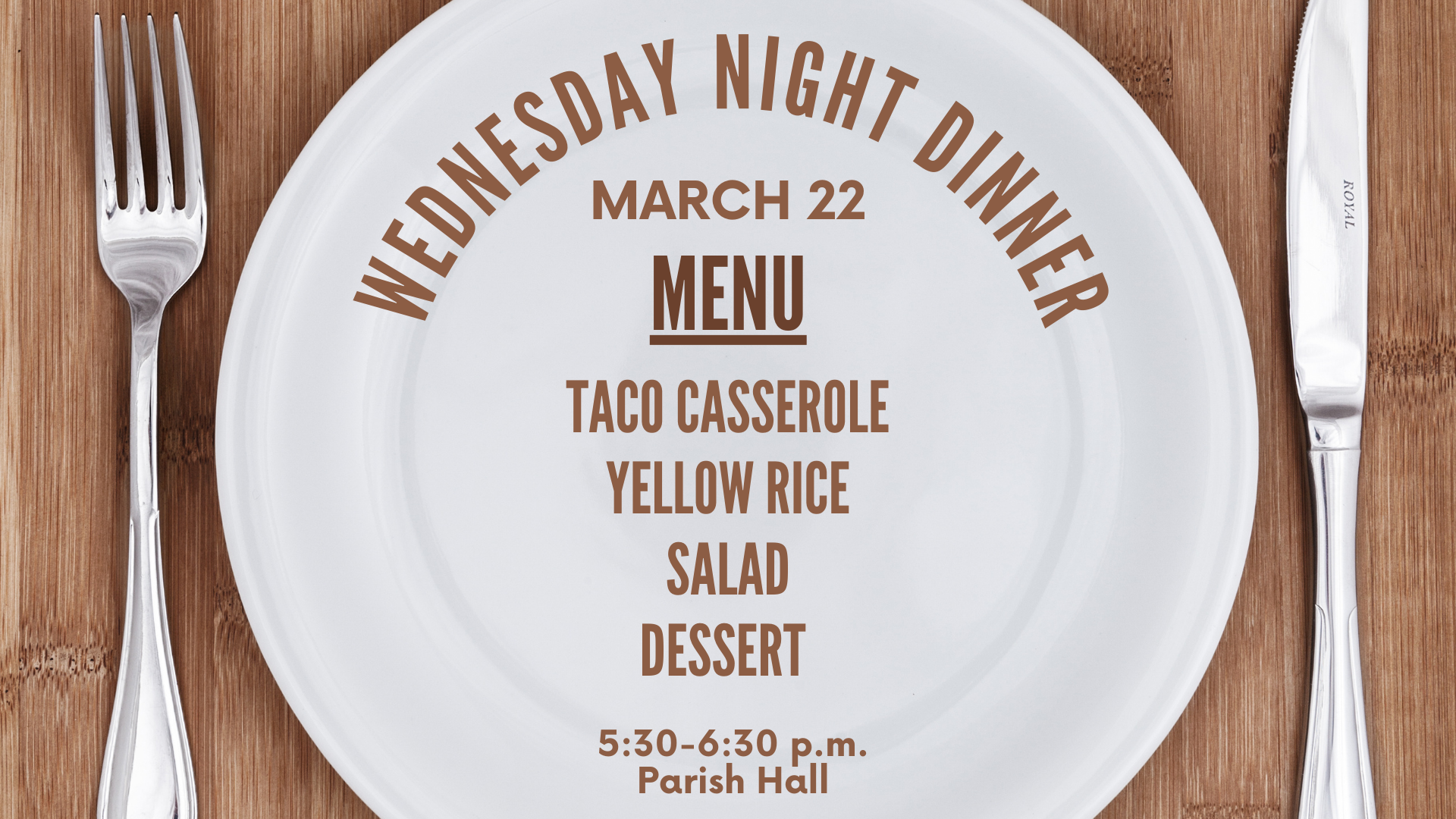 5:30 - 6:30 p.m. Weekly dinner in the Parish Hall (see menu below)