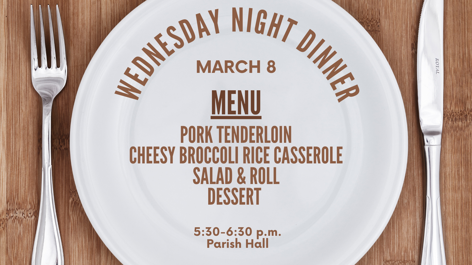 5:30 - 6:30 p.m. Weekly dinner in the Parish Hall (see menu below)